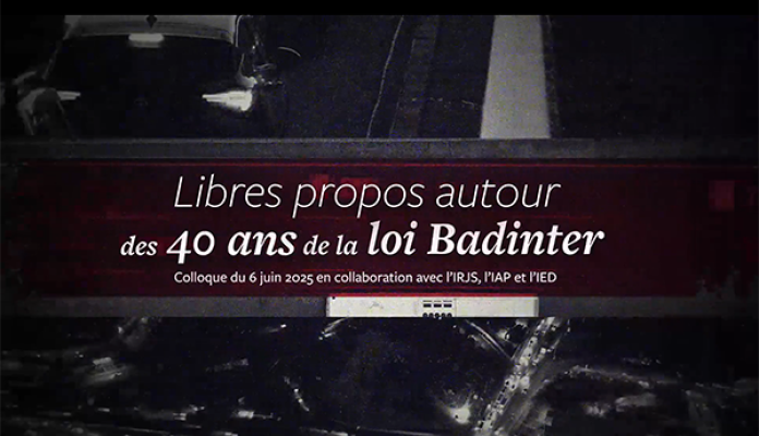 Ces vidéos sont extraites du colloque « Libres propos autour des 40 ans de la loi Badinter », placé sous la direction scientifique d’Anne Guégan, maîtresse de conférences HDR à l’École de droit de la Sorbonne (Université Paris 1 Panthéon-Sorbonne) et organisé en juin 2025 avec la collaboration de l’IRJS, l’IAP et l’IED.